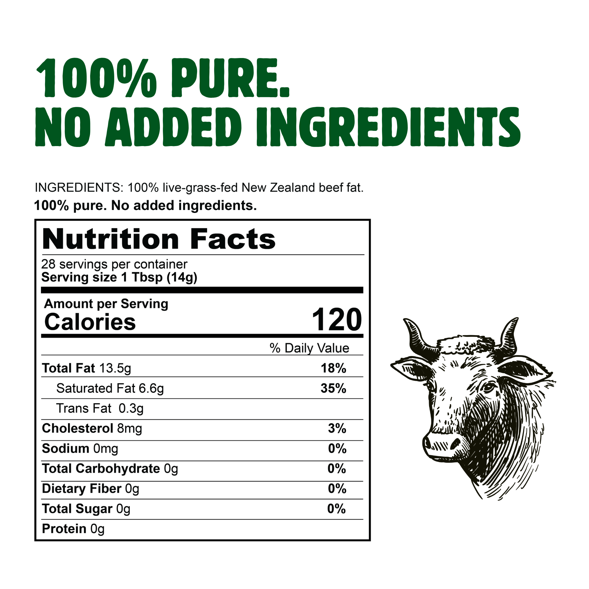 It is a pure, natural cooking fat rendered from 100% live-grass-fed, free-range New Zealand beef. We gently refine the fat without additives, chemicals, or hydrogenation to create a clean, flavorful, nutrient-rich traditional cooking fat.