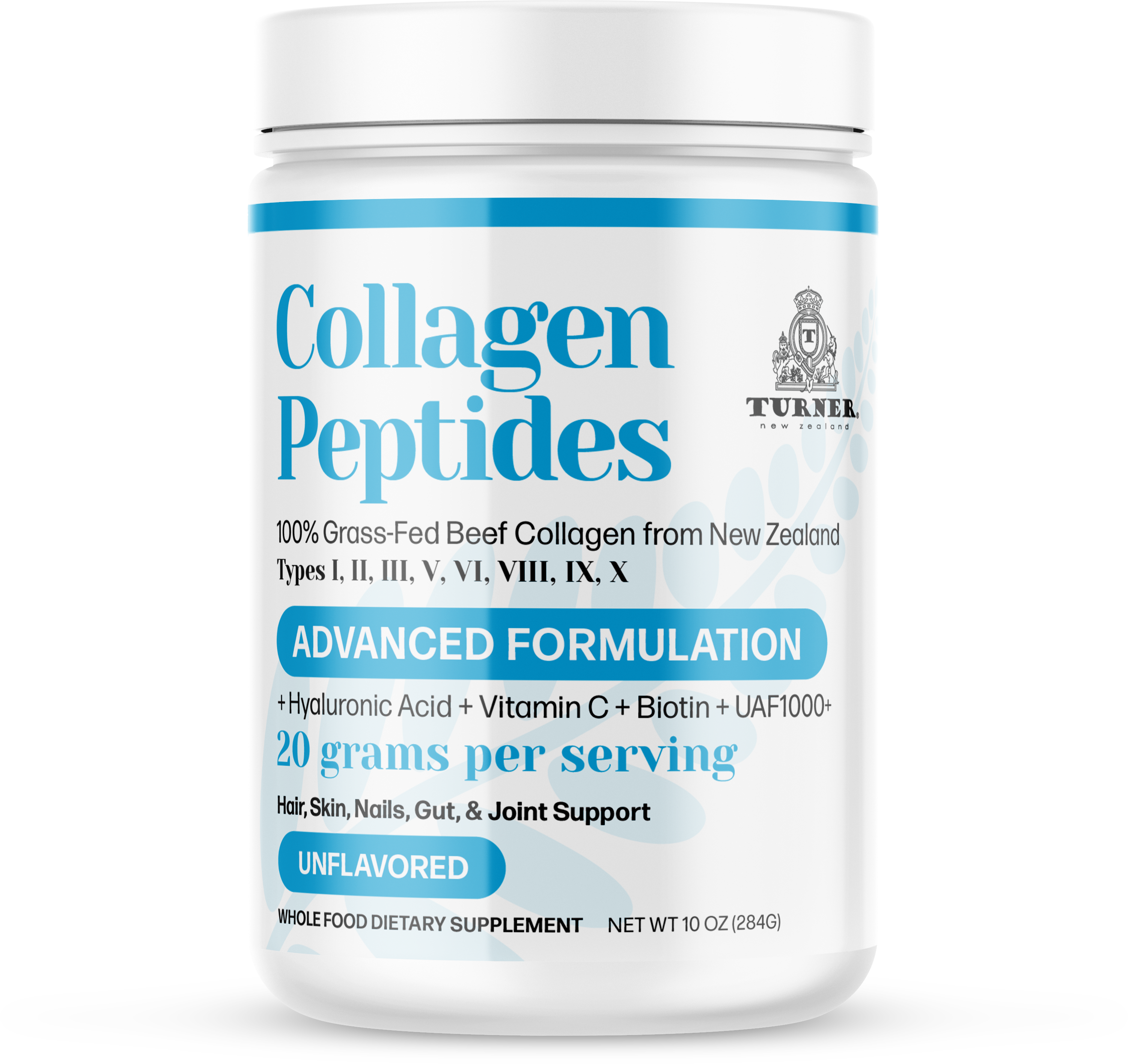 Hydrolyzed collagen peptides from New Zealand pasture-raised beef deliver Types I, II, III, V, VI, VIII, IX & X — the key proteins for skin, bones, cartilage, tendons & ligaments.