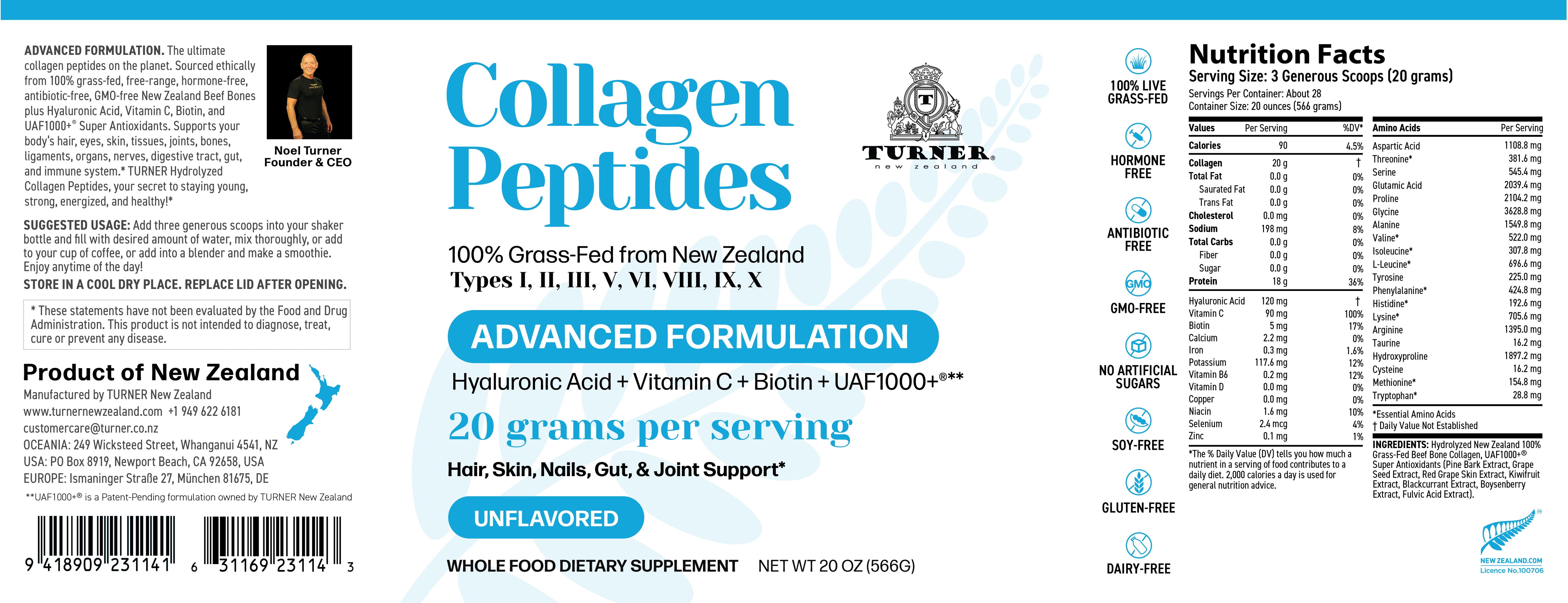 - Hydrolyzed Collagen Peptides (NZ 100% live-grass-fed) — 20 g per serving (3 generous scoops)