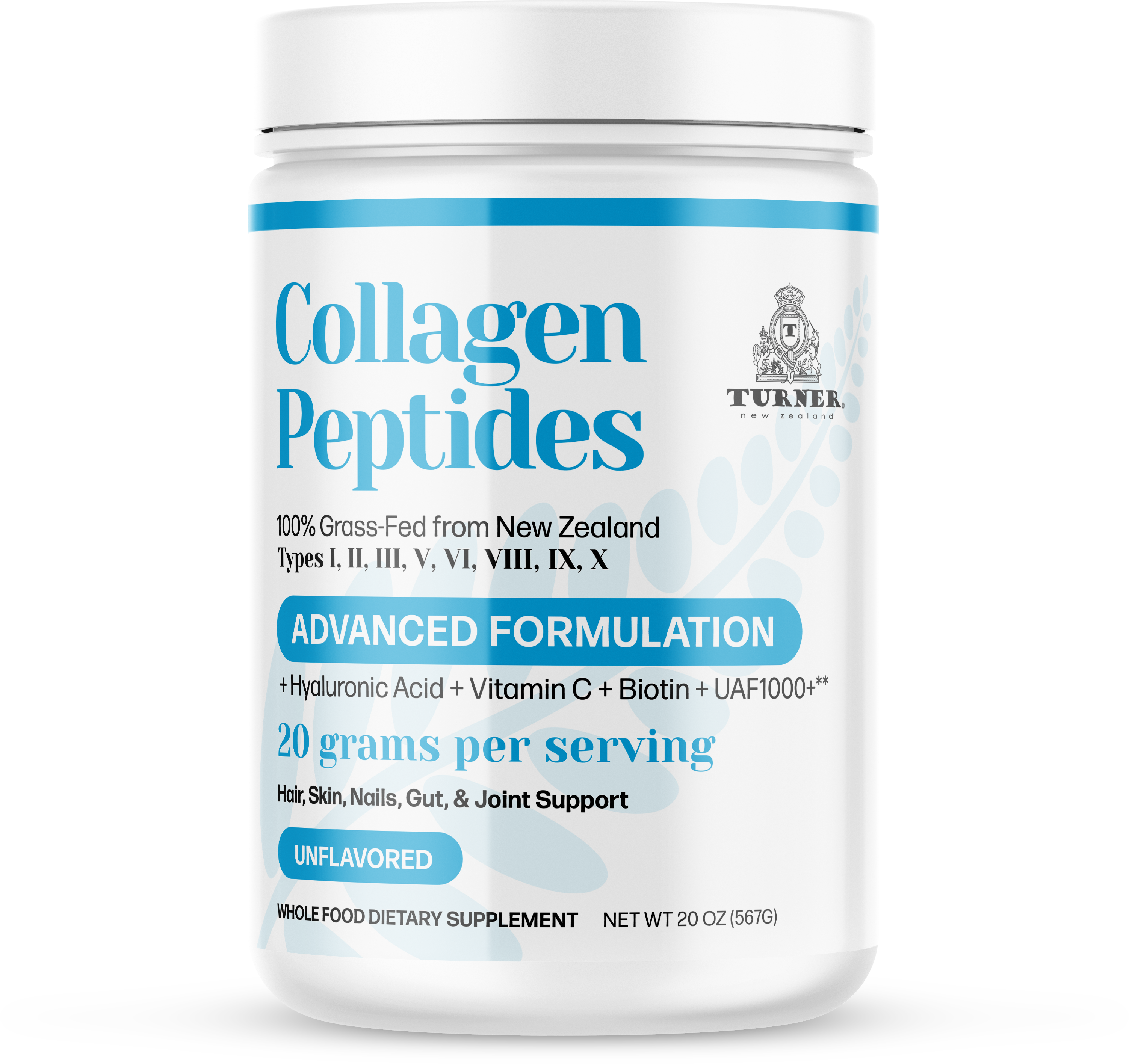 Hydrolyzed collagen peptides from New Zealand pasture-raised beef deliver Types I, II, III, V, VI, VIII, IX & X — the key proteins for skin, bones, cartilage, tendons & ligaments.