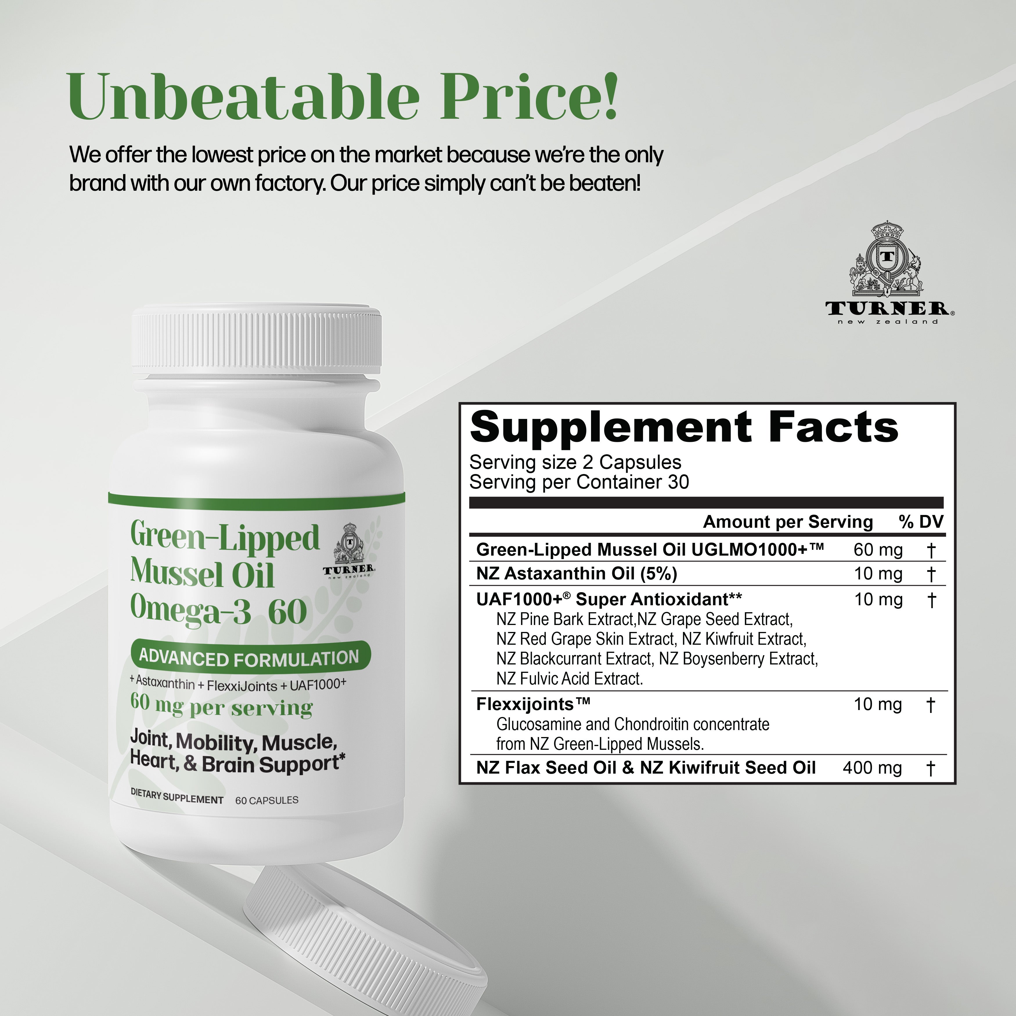 This innovation became the foundation of TURNER Green-Lipped Mussel Oil—a breakthrough supplement combining New Zealand’s most potent marine lipids with TURNER’s exclusive UAF1000+ super-antioxidant blend, delivering 53 times more antioxidant protection than standard fish oil.