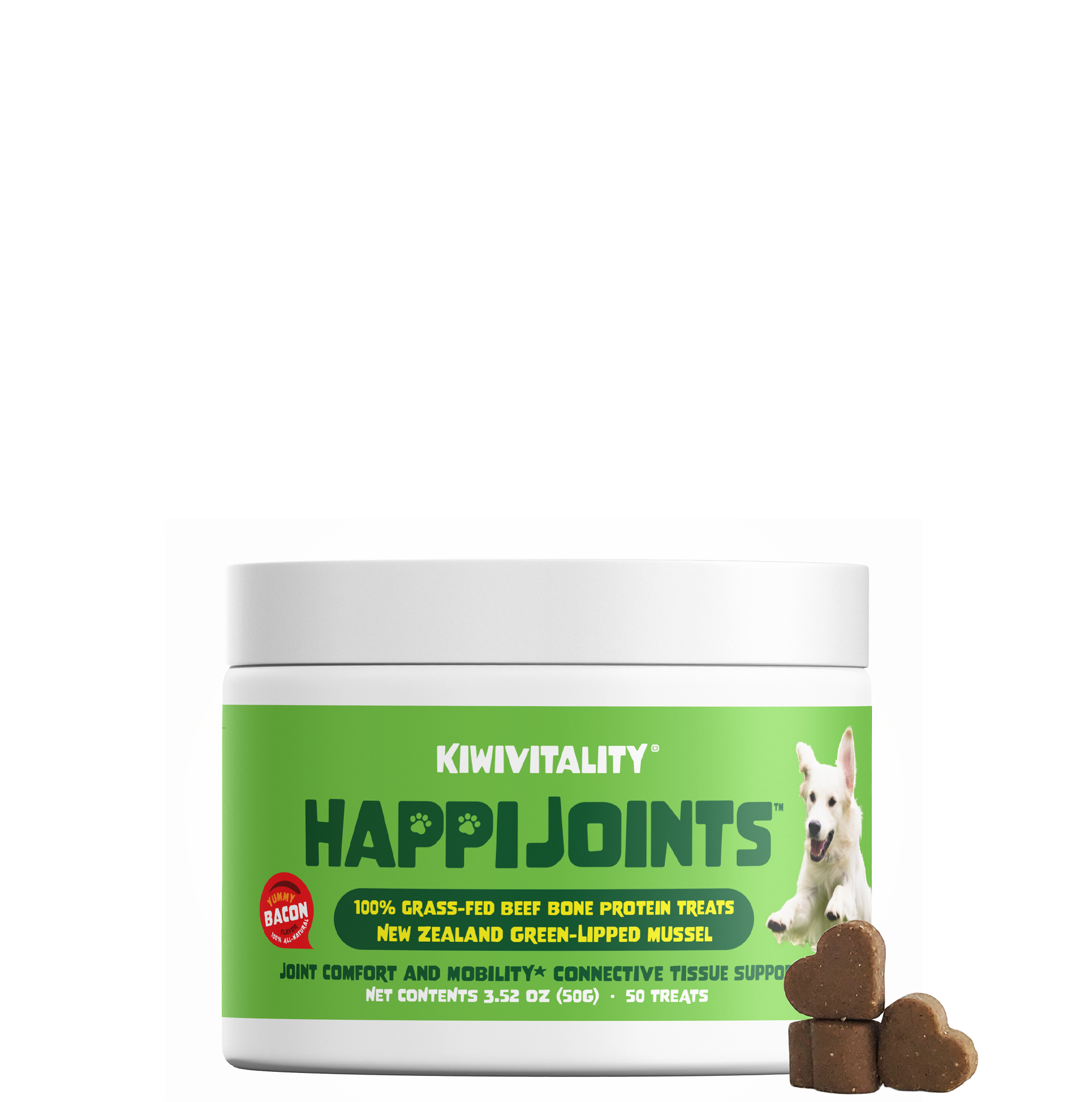 - Advanced Dog Hip & Joint Care Formula. Experience the Benefits of Green-Lipped Mussels, a natural source of 18 Omega-3 Fatty Acids, Glucosamine, and Chondroitin with HappiJoints: Providing essential daily support for your dog's hip and joint health. This effective and safe unique protein source helps alleviate arthritis symptoms and contributes to the maintenance of healthy joints, muscles, and agility.