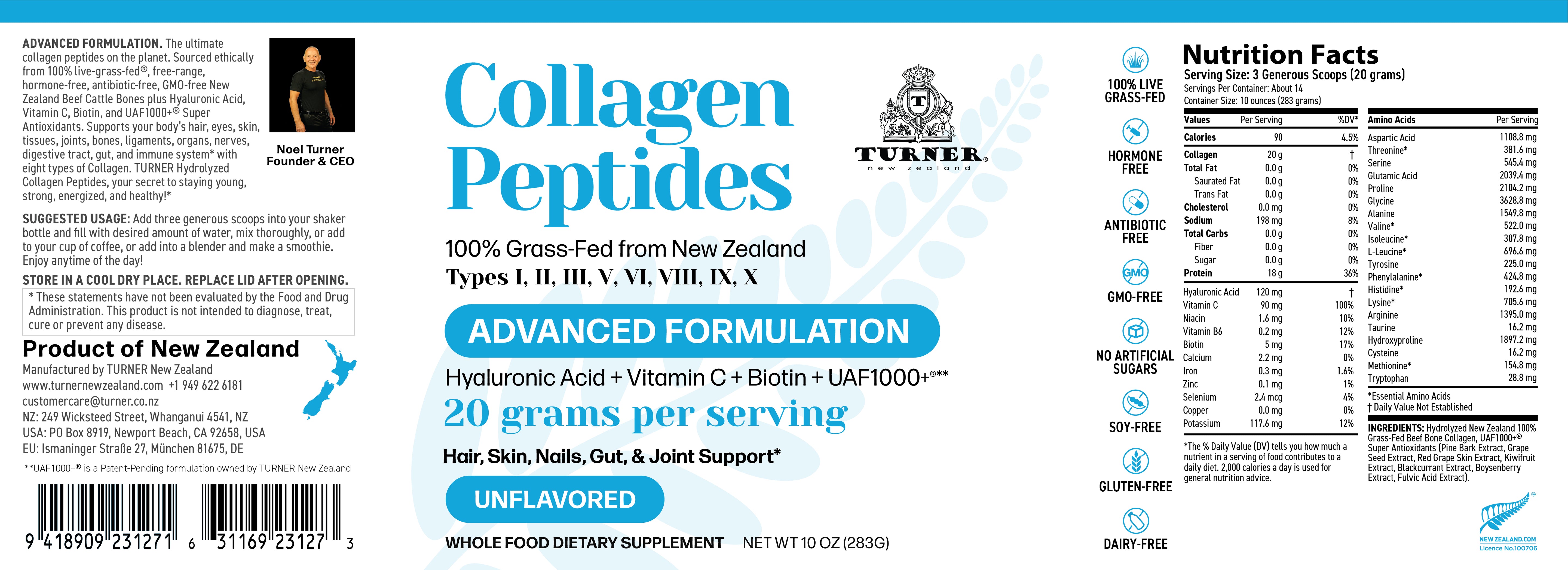 • Plus: Hyaluronic Acid • Vitamin C • Zinc • Biotin • UAF1000+® (Pine Bark, Grape Seed, Red Grape Skin, Kiwifruit, Blackcurrant, Boysenberry, Fulvic Acid)