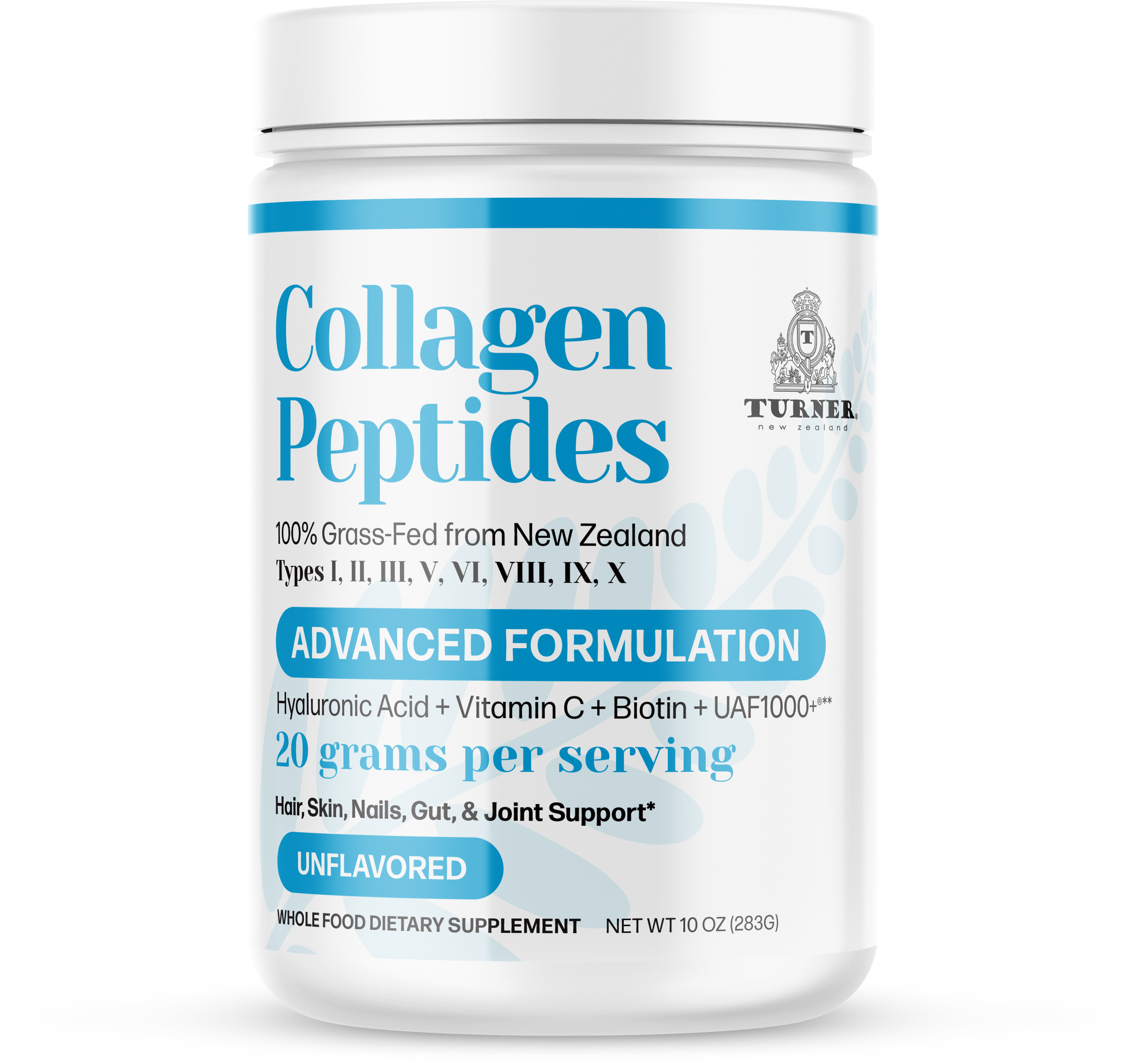 Hydrolyzed collagen peptides from New Zealand pasture-raised beef deliver Types I, II, III, V, VI, VIII, IX & X — the key proteins for skin, bones, cartilage, tendons & ligaments.