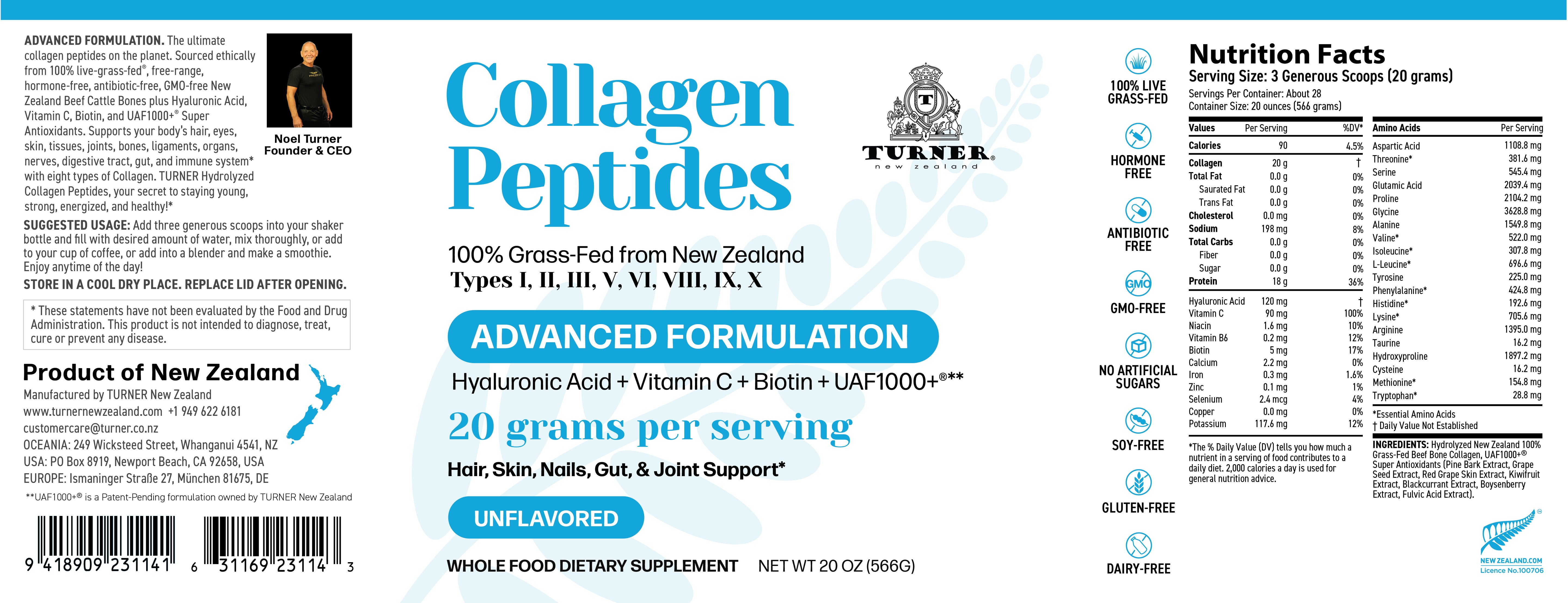 - Hydrolyzed Collagen Peptides (NZ 100% live-grass-fed) — 20 g per serving (3 generous scoops)