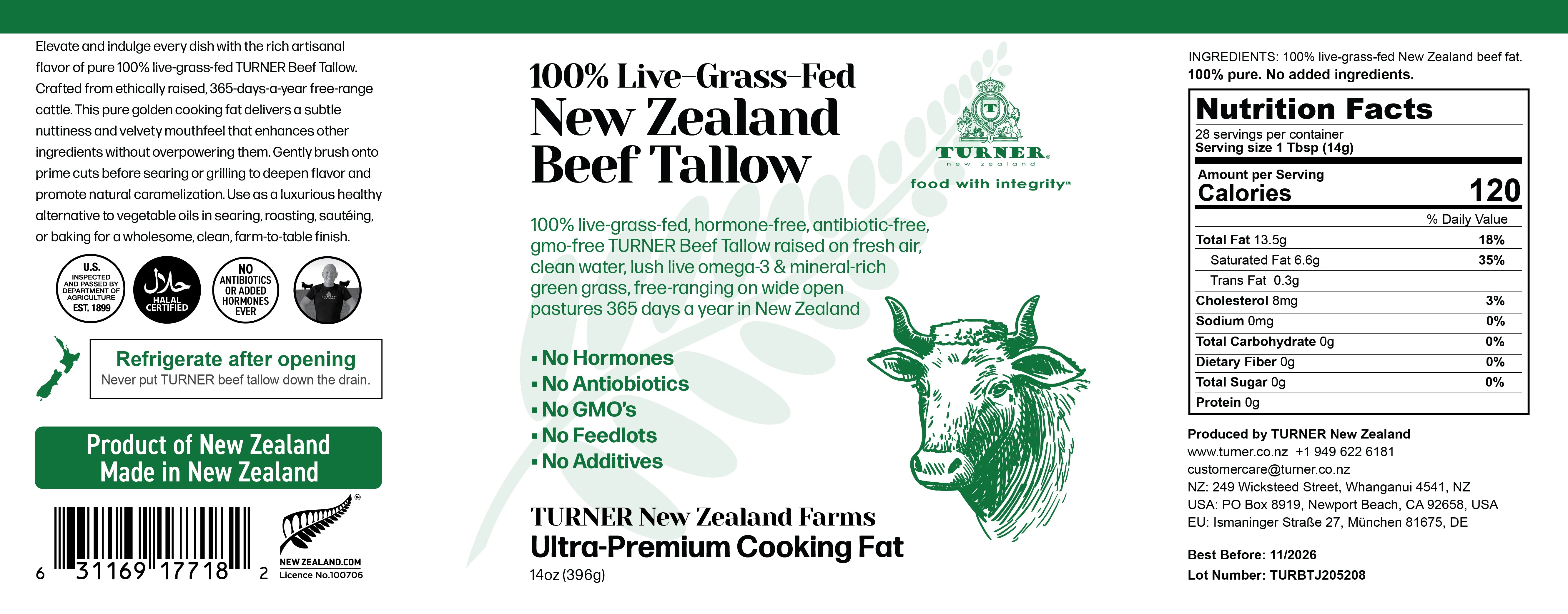 - FARM-TO-TABLE PURITY – TURNER 100% Live-Grass-Fed Beef Tallow is born under the open skies of New Zealand, where cattle roam free 365 days a year, grazing on lush green grass, drinking fresh water, and breathing clean air. The result? The purest cooking fat nature can provide.