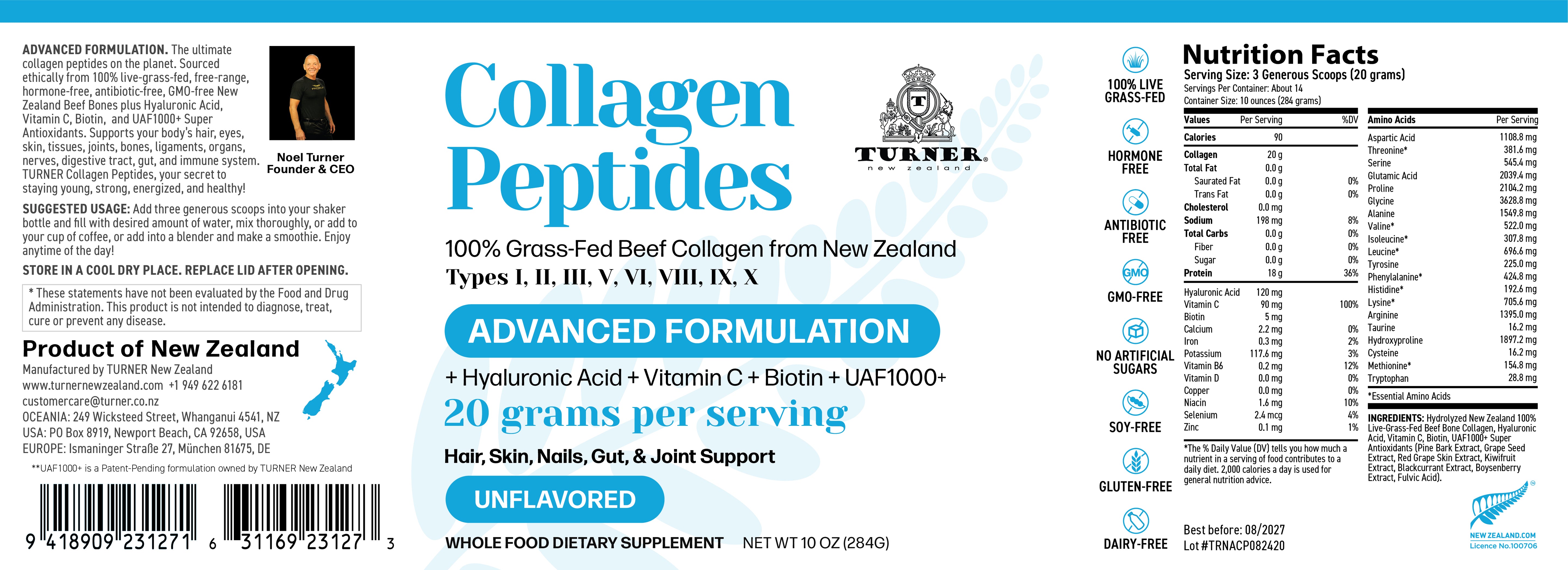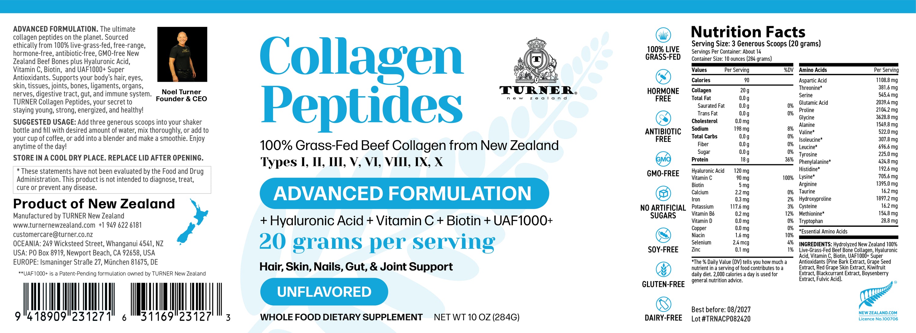 Hydrolyzed collagen peptides from New Zealand pasture-raised beef deliver Types I, II, III, V, VI, VIII, IX & X — the key proteins for skin, bones, cartilage, tendons & ligaments.